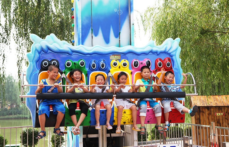 青蛙跳”游藝機(jī)是屬于一種勻速升高、分段下降的游樂(lè)設(shè)備,設(shè)備配有六個(gè)座位。操作人員待游客坐好后,扣好安全帶、桿,游客升高到一定高度,然后會(huì)跳躍式分段下降,猶如坐在大青蛙的背上蹦蹦跳跳的感覺(jué)。深受游客的喜歡,特別是青少年游客的喜愛(ài)。